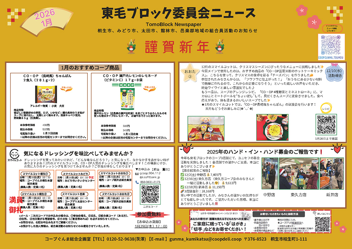 ブロック委員会ニュースは、コープぐんまの各ブロック委員(組合員)が月一回発行する、地域のイベントやくらしに役立つ情報、機関運営等をお知らせするニュースです。