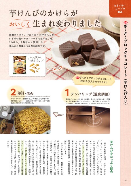 ざくざくブロックチョコレート(芋けんぴ入り)02おすすめ!コープの商品芋けんぴのかけらが生まれ変わりましたおいしく表面ざくざく、中ほくほくの芋けんぴを、口どけの良いチョコレートで包みました。「かけら」を無駄なく使用した、食品ロス削減につながる商品です。ざくざくブロックチョコレート(芋けんぴ入り)ができるまでかくはん拌・混合攪芋けんぴのかけらを機械に投入(写真B)。少し砕きながら攪拌機でチョコレートと混ぜ合わせます(C)。ここでも回転する羽根が芋けんぴを砕きます。テンパリング(温度調整)原料のチョコレートをタンクに投入、熱を加えて溶かします(写真A)。別の機械に移していったん冷まし、再び加熱。テンパリングという工程で、艶のあるなめらかな口どけのチョコレートになります。BA芋けんぴをたっぷり配合楽しい食感が人気の「CO・OPざくざくブロックチョコレート(芋けんぴ入り)」は、「CO・OP九州の芋けんぴ」などの製造時に出るかけらをチョコレートで固めたお菓子。かけらが廃棄されていることを知った生協職員の「もったいない!」という気持ちから、半年弱の開発期間を経て1月に発売されました。創2024年1業120年を超えるお菓子メーカー・平塚製菓株式会社が、千葉県香取市で製造しています。SDGsが広まり、廃棄される原料を活用したお菓子は増えていますが、製品化は簡単ではありません。「例えば傷があって出荷できない果物を使う場合も、お菓子にするにはピューレにして糖度を調整したり、煮詰めてゼリーにしたりする必要があります。芋けんぴがスムーズに製品化できたのは、加工せずそのまま使えたから」と商品開発課の大也さんは説明します。「芋けんぴをたくさん入れた方がおいしいと思い、ギリギリの配合率を攻めました。チョコレートはビターやホワイトなども試しましたが、芋の風味と最も合うミルクタイプに決めました」川友おおかわともや
