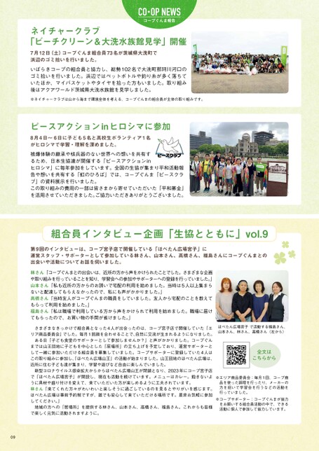 コープぐんま報告ネイチャークラブ「ビーチクリーン&大洗水族館見学」開催7月12日(土)コープぐんま組合員73名が茨城県大洗町で浜辺のゴミ拾いを行いました。いばらきコープの組合員と協力し、総勢102名で大洗町那珂川河口のゴミ拾いを行いました。浜辺ではペットボトルや釣り糸が多く落ちていたほか、マイバスケットやタイヤを拾った方もいました。取り組み後はアクアワールド茨城県大洗水族館を見学しました。※ネイチャークラブは山から海まで環境全体を考える、コープぐんまの組合員が主体の取り組みです。ピースアクションinヒロシマに参加8月4日~6日に子ども5名と高校生ボランティア1名がヒロシマで学習・理解を深めました。被爆体験の継承や核兵器のない世界への想いを共有するため、日本生協連が開催する「ピースアクションinヒロシマ」に毎年参加をしています。全国の生協が集まり平和活動報告や想いを共有する「虹のひろば」では、コープぐんま「ピースクラブ」の資料展示を行いました。この取り組みの費用の一部は皆さまから寄せていただいた「平和募金」を活用させていただきました。ご協力いただきありがとうございました。組合員インタビュー企画「生協とともに」vol.9第9回のインタビューは、コープ宮子店で開催している「ほぺたん広場宮子」に運営スタッフ・サポーターとして参加している林さん、山本さん、高橋さん、福島さんにコープぐんまとの出会いや活動についてお話を伺いました。林さん「コープぐんまとの出会いは、近所の方から声をかけられたことでした。さまざまな企画や取り組みを行っていることを知り、学習会への参加やサポーターへの登録を行っていました。」山本さん「私も近所の方からのお誘いで宅配の利用を始めました。当時は5人以上集まらないと配達してもらえなかったので、私にも声がかかりました。」高橋さん「当時友人がコープぐんまの職員をしていました。友人から宅配のことを教えてもらって利用を始めました。」福島さん「私は職場で利用している方から声をかけられて利用を始めました。職場に届けてもらったので、お買い物の手間が省けました。」さまざまなきっかけで組合員となった4人が出会ったのは、コープ宮子店で開催していた「エリア商品委員会」でした。毎月1回顔を合わせることで、自然に交流が生まれるようになりました。ある日「子ども食堂のサポーターとして参加しませんか?」と声がかかりました。コープぐんまでは山王団地に子どもを中心とした「居場所」の立ち上げを予定しており、運営サポーターとして一緒に参加いただける組合員を募集していました。コープサポーターに登録していた4人はこの取り組みに参加し、「ほぺたん広場山王」の活動が始まりました。山王団地のほぺたん広場は、近所に住む子ども達が集まり、学習や遊びなど自由に楽しんでいました。新型コロナウイルス感染拡大からからほぺたん広場山王が閉鎖となり、2023年にコープ宮子店で「ほぺたん広場宮子」が開設し、現在も活動を続けています。メニューはカレー。飽きないように具材や盛り付けを変えて、来ていただいた方が楽しめるように工夫されています。林さん「来てくれた方々がわいわいと楽しそうに過ごしているのを見るとやりがいを感じます。ほぺたん広場は事前予約制ですが、誰でも安心して来ていただける場所です。是非お気軽に参加してください。」地域の方への「居場所」を提供する林さん、山本さん、高橋さん、福島さん。これからも皆様で楽しく元気に活動されますように。ほぺたん広場宮子で活動する福島さん、山本さん、林さん、高橋さん(左から)全文はこちらから※エリア商品委員会:毎月1回、コープ商品を使った調理を行ったり、メーカーの方を招いて学習会を行うなどの活動を行っていました。※コープサポーター:コープぐんまが協力をお願いする組合員活動の中で、できる活動に個人で参加して協力しています。09