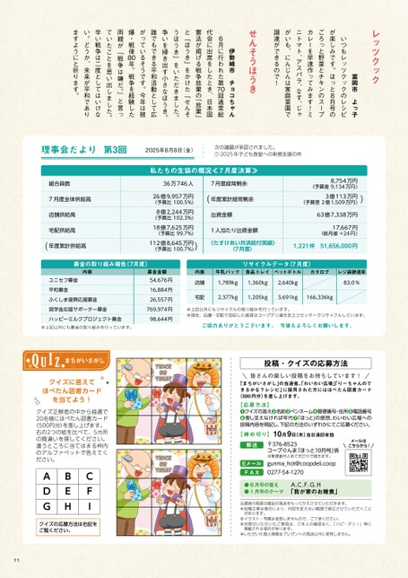 レッツクック富岡市よっ子いつもレッツクックのレシピが楽しみです。ほっと8月号のごろっと野菜とチキンのスープカレーを早速作ってみます!ミニトマト、アスパラ、なす、じゃがいも、にんじんは家庭菜園で調達ができるので!せんそうほうき6月に行われた第7伊勢崎市チョコちゃん0回通常総代会に出席をしたとき、日本国憲法が掲げる戦争放棄の「放棄」と「ほうき」をかけた「せんそうほうき」をいただきました。争いを掃き出す小さなほうき。誰でもできる平和活動として広がっているそうです。今年は被0年。戦争を経験した爆・戦後8両親が「戦争は嫌だ。」と言っていたことを思い出しました。辛い戦争は二度としてはいけない。どうか、未来が平和でありますようにと祈ります。理事会だより第3回2025年8月8日(金)次の議題が承認されました。①2025年子ども食堂への新規支援の件組合員数7月度全体供給高店舗供給高宅配供給高(年度累計供給高私たちの生協の概況≪7月度決算≫36万746人7月度経常剰余(年度累計経常剰余出資金額1人当たり出資金額26億9,957万円(予算比100.5%)8億2,244万円(予算比102.3%)18億7,625万円(予算比99.7%)112億8,645万円(予算比100.7%)8,754万円(予算差9,134万円)3億113万円(予算差2億1,509万円))63億7,338万円17,667円(前月差+24円)募金の取り組み報告(7月度)内容募金金額ユニセフ募金平和募金ふくしま復興応援募金奨学金応援サポーター募金ハッピーミルクプロジェクト募金※上記以外にも募金の取り組みを行っています。54,676円16,884円26,557円769,974円98,644円)《たすけあい共済給付実績》(7月度)1,221件51,656,000円リサイクルデータ(7月度)牛乳パック食品トレイペットボトルカタログ1,789kg1,360kg2,640kg2,377kg1,205kg3,691kg166,336kg内容店舗宅配レジ袋辞退率83.0%※上記以外にもリサイクルの取り組みを行っています。※現在、店舗・宅配で回収した資源はコープデリ連合会エコセンターでリサイクルしています。ご協力ありがとうございます。今後もよろしくお願いします。まちがいさがし投稿・クイズの応募方法皆さんの楽しい投稿をお待ちしています!「まちがいさがし」の当選者、「わいわい広場」りーちゃんのできるかな?レシピ」に採用された方にはほぺたん図書カード(500円分)を差し上げます。【応募方法】❶クイズの答え❷名前❸ペンネーム❹郵便番号・住所❺電話番号❻差し支えなければ年代❼「ほっと」の感想、わいわい広場への投稿内容を明記し、下記の方法のいずれかにてご応募ください。メールはこちらから!【締め切り】10月9日(木)当日消印有効郵送EメールFAX〒376-8523コープぐんま「ほっと10月号」係※郵便番号とあて先だけで届きます。gunma_hot@coopdeli.coop0277-54-1270●8月号の答え●1月号のテーマA.C.F.G.H「我が家のお雑煮」当選者の発表は賞品の発送をもってかえさせていただきます。※投稿文章は場合により、内容を変えない範囲で修正させていただくことがあります。※イラスト・写真は返却しませんので、ご了承ください。※お寄せいただいたご意見は、ご本人の確認なく、「ハピ・デリ!」等に掲載される場合があります。※いただいた個人情報はプレゼントの発送以外に使用しません。クイズに答えてほぺたん図書カードを当てよう!クイズ正解者の中から抽選で20名様にほぺたん図書カード(500円分)を差し上げます。右の2つの絵を比べて、5カ所の間違いを探してください。違うところに当てはまる枠内のアルファベットで答えてください。CFIBEHADGクイズの応募方法は右記をご覧ください。11