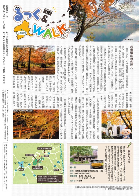 in高崎市紅葉の榛名湖伊香保森林公園「もみじの広場」※観光ぐんま写真館提供秋爛漫の榛名湖へ富士山にそっくりな榛名富士を湖面に映し出し、見事な「逆さ富士」を見せてくれる榛名湖。四方を榛名富士、掃部ヶ岳、烏帽子ヶ岳などの山々から成る榛名山に囲まれたこの湖は、古くは「いかほぬま」とよばれ、万葉集にもその名が詠まれている名勝地です。えぼしがだけかもんがだけとくとみろか江戸時代になると、榛名山北麓に湧く伊香保温泉から榛名湖、榛名神社を巡る旅行が庶民に広まりました。明治時代には、画家の竹久夢二や文豪の徳富蘆花、歌人の与謝野晶子ら名だたる文人が訪れるようになり、大正1年に県内で最初の県立公園として開園。観光地として一躍人気が高まり、今も一年を通じて多くのレジャー客が訪れます。3春の桜、夏の花火、冬のイルミネーションと四季折々に彩られる榛名湖ですが、秋は格別。燃えたつような紅葉が湖畔を染め上げます。かしなら秋深まる頃、ほぺたんは湖畔のハイキングコースを散策。朱や黄に色づく楢、樫、桜などの樹々の間から、輝く湖面がのぞきます。ボートにも乗って湖上から錦秋の榛名山を眺め、すっかりご満悦。少し足をのばして、周辺の紅葉スポットも訪ねてみましょう。ほぺたんが向かったのは群馬県立伊香保森林公園。管理棟がある駐車場からほど近い「もみじの広場」では、錦を広げたようなもみじの森が出迎えてくれます。ほぺたん、竹久夢二伊香保記念館へ!その足で伊香保方面へ山をくだり、立ち寄ったのは竹久夢二伊香保記念館。大正時代に美人画で一世を風靡した夢二は、榛名をこよなく愛し、湖畔にアトリエを構えました。ほぺたんは、夢二の晩年の大作「榛名山賦」を鑑賞。記念館が建つ「大正ロマンの森」には和洋の趣ある建物が点在し、秋には紅葉が彩りを添えて、ロマンチックな風情に浸ることができます。かじかばし日が暮れる頃、最後に訪れたのは伊香保温泉街。ほぺたんは観光客でにぎわう伊香保名物の石段を365段のぼり、湯元近くにかかる河鹿橋へ。朱塗りの太鼓橋ともみじの紅葉がライトアップで艶やかに浮きあがり、訪れる人を幻想的な世界へ誘います。河鹿橋※観光ぐんま写真館提供※掲載した店舗・施設は、定休日以外に臨時休業となる場合もあるので、ご了承ください。※一部取材先より画像をお借りしています。取材帰り、囲炉裏のある古民家でひと息。炭火焼きのとうもろこしやいも串、自家製くず餅が名物の茶屋で、ご主人が地元食材を手間ひまかけて調理しています。焼きたてのとうもろこしは目を見張るおいしさ!とうもろこしは例年10月上旬まで、いも串は9月下旬からです。鹿火屋住所…北群馬郡吉岡町上野田1329-127TEL…0279-54-3920営業時間…9:30~16:00日・祝9:30~16:30定休日…不定休至高崎駅上越新幹線16415至上毛高原駅33烏帽子ヶ岳掃部ヶ岳28榛名富士333312628広報誌ほっと2025年10月号(vol.309)発行日/2025年9月22日発行者/生活協同組合コープぐんま理事長大貫晴雄編集/コープぐんま総合企画室〒376-8523桐生市相生町1-111TEL.0277(52)9618ホームページ/https://gunma.coopnet.or.jp/ⓒ生活協同組合コープぐんま2025宅配では、お届けしている全てのカタログを回収し、リサイクルしています。ご不要の場合は、担当者に渡すか配達器材に入れてお戻しください。