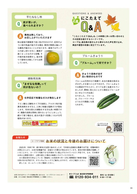 平たねなし柿皮が青いが、食べられますか?果肉は熟しており、お召し上がりいただけます柿は昼夜の寒暖差で皮に色が付きますが、近年のように夜の気温が高すぎる場合、果肉の熟度は進んでも着色が進まないことがあります。産地ではサンプルの試し切りを行い、糖度が高くなったものから収穫、その後渋抜き処理をし、抜き取りで食味を点検してから出荷しています。掃除用洗剤「まぜるな危険」って何が危ないの?化学反応で有毒なガスが発生しますクエン酸など酸性タイプの洗剤と、アルカリ性の塩素系洗剤をまぜると、人体に有毒な塩素ガスが発生します。年末を控え大掃除をする方も多い時期ですが、複数の洗剤は同時に使わないようにしましょう。続けて使う場合も、成分が混ざり危害につながる可能性があります。にこたえてQ&A「こえにこたえてQ&A」は、この時期に多いお問い合わせとその回答を紹介するコーナーです。コープは、組合員の皆さんから寄せられた声を受け止め、商品や運営の改善に役立てています。ブルームきゅうり「ブルーム」って何ですか?きゅうり自体が出す白い粉状のものですブルームは天然のロウ物質で、水分の蒸発を防ぎみずみずしさを保つことができます。ブルームきゅうりは果皮がやわらかく、かつては多く生産されていましたが、異物に見えることから現在はブルームがないきゅうりが主流になりました。ブルームは、ブルーベリーやぶどうなどの表面にも見られます。バックナンバーもご覧いただけます。お知らせコープデリ宅配お米の状況と今後のお届けについて2025年(令和7年)産の新米が出回り始めましたが、今年度も記録的な酷暑や水不足、収穫時期の大雨などにより、お米の収穫量不足・歩留まりの悪化が見込まれています。新米の取引価格が高騰していることから、コープデリ宅配では12月頃までに値上げをさせていただく予定です。なお、引き続きお米は上限数を設け、上限を超えた場合は抽選とさせていただきます。また現在受付を休止している「登録米」は2026年1月~3月に期間限定で新規の登録を受け付ける予定です。チラシやeフレンズでご案内しますので、ぜひご検討ください。詳しくは、ホームページをご確認ください。お気づきの点やコープへの各種お問い合わせは、コープデリコールセンター・店舗、または右記「組合員の声事務局」にご連絡ください。●コープぐんま組合員の声事務局0120-934-011受付/土・日を除く9:00〜17:0006