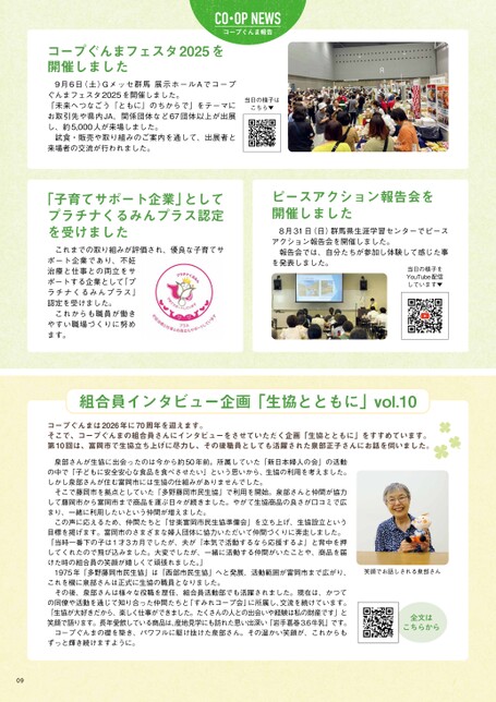 コープぐんまフェスタ2025を開催しましたコープぐんま報告9月6日(土)Gメッセ群馬展示ホールAでコープぐんまフェスタ2025を開催しました。「未来へつなごう『ともに』のちからで」をテーマにお取引先や県内JA、関係団体など67団体以上が出展し、約5,000人が来場しました。試食・販売や取り組みのご案内を通して、出展者と来場者の交流が行われました。「子育てサポート企業」としてプラチナくるみんプラス認定を受けましたこれまでの取り組みが評価され、優良な子育てサポート企業であり、不妊治療と仕事との両立をサポートする企業として「プラチナくるみんプラス」認定を受けました。これからも職員が働きやすい職場づくりに努めます。当日の様子はこちら▼ピースアクション報告会を開催しました8月31日(日)群馬県生涯学習センターでピースアクション報告会を開催しました。報告会では、自分たちが参加し体験して感じた事を発表しました。当日の様子をYouTube配信しています▼組合員インタビュー企画「生協とともに」vol.10コープぐんまは2026年に70周年を迎えます。そこで、コープぐんまの組合員さんにインタビューをさせていただく企画「生協とともに」をすすめています。第10回は、富岡市で生協立ち上げに尽力し、その後職員としても活躍された泉部正子さんにお話を伺いました。泉部さんが生協に出会ったのは今から約50年前。所属していた「新日本婦人の会」の活動の中で「子どもに安全安心な食品を食べさせたい」という思いから、生協の利用を考えました。しかし泉部さんが住む富岡市には生協の仕組みがありませんでした。そこで藤岡市を拠点としていた「多野藤岡市民生協」で利用を開始。泉部さんと仲間が協力して藤岡市から富岡市まで商品を運ぶ日々が続きました。やがて生協商品の良さが口コミで広まり、一緒に利用したいという仲間が増えました。この声に応えるため、仲間たちと「甘楽富岡市民生協準備会」を立ち上げ、生協設立という目標を掲げます。富岡市のさまざまな婦人団体に協力いただいて仲間づくりに奔走しました。「当時一番下の子は1才3カ月でしたが、夫が『本気で活動するなら応援するよ』と背中を押してくれたので飛び込みました。大変でしたが、一緒に活動する仲間がいたことや、商品を届けた時の組合員の笑顔が嬉しくて頑張れました。」1975年「多野藤岡市民生協」は「西部市民生協」へと発展、活動範囲が富岡市まで広がり、これを機に泉部さんは正式に生協の職員となりました。その後、泉部さんは様々な役職を歴任、組合員活動部でも活躍されました。現在は、かつての同僚や活動を通じて知り合った仲間たちと「すみれコープ会」に所属し、交流を続けています。「生協が大好きだから、楽しく仕事ができました。たくさんの人との出会いや経験は私の財産です」と笑顔で語ります。長年愛飲している商品は、産地見学にも訪れた思い出深い「岩手葛巻3.6牛乳」です。コープぐんまの礎を築き、パワフルに駆け抜けた泉部さん。その温かい笑顔が、これからもずっと輝き続けますように。笑顔でお話しされる泉部さん全文はこちらから09