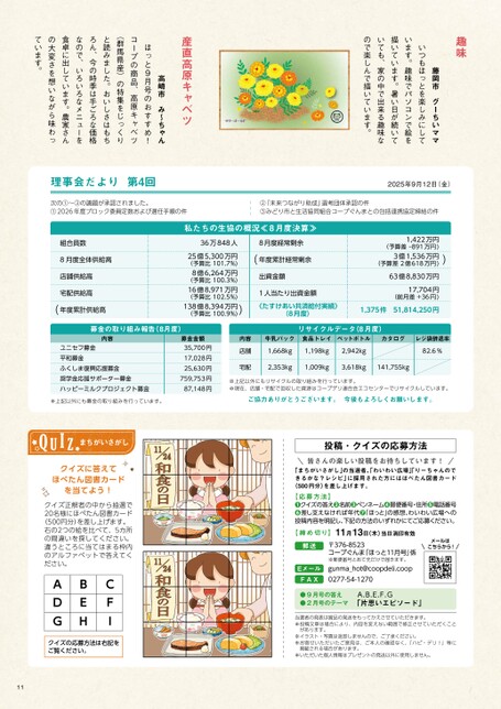 趣味藤岡市グーちいママいつもほっとを楽しみにしています。趣味でパソコンで絵を描いています。暑い日が続いていても、家の中で出来る趣味なので楽しんで描いています。2025年9月12日(金)産直高原キャベツ高崎市み~ちゃんほっと9月号のおすすめ!コープの商品、高原キャベツ(群馬県産)の特集をじっくりと読みました。おいしさはもちろん、今の時季は手ごろな価格なので、いろいろなメニューを食卓に出しています。農家さんの大変さを想いながら味わっています。理事会だより第4回次の①~③の議題が承認されました。①2026年度ブロック委員定数および選任手順の件②「未来つながり助成」選考団体承認の件③みどり市と生活協同組合コープぐんまとの包括連携協定締結の件組合員数8月度全体供給高店舗供給高宅配供給高(年度累計供給高私たちの生協の概況≪8月度決算≫36万848人8月度経常剰余25億5,300万円(予算比101.7%)8億6,264万円(予算比100.3%)16億8,971万円(予算比102.5%)138億8,394万円(予算比100.9%)(年度累計経常剰余出資金額1人当たり出資金額)《たすけあい共済給付実績》(8月度)1,422万円(予算差-891万円)3億1,536万円(予算差2億618万円))63億8,830万円17,704円(前月差+36円)1,375件51,814,250円募金の取り組み報告(8月度)内容募金金額ユニセフ募金平和募金ふくしま復興応援募金奨学金応援サポーター募金ハッピーミルクプロジェクト募金35,700円17,028円25,630円759,753円87,148円※上記以外にも募金の取り組みを行っています。リサイクルデータ(8月度)牛乳パック食品トレイペットボトルカタログ1,668kg1,198kg2,942kg2,353kg1,009kg3,618kg141,755kg内容店舗宅配レジ袋辞退率82.6%※上記以外にもリサイクルの取り組みを行っています。※現在、店舗・宅配で回収した資源はコープデリ連合会エコセンターでリサイクルしています。ご協力ありがとうございます。今後もよろしくお願いします。まちがいさがし投稿・クイズの応募方法皆さんの楽しい投稿をお待ちしています!「まちがいさがし」の当選者、「わいわい広場」りーちゃんのできるかな?レシピ」に採用された方にはほぺたん図書カード(500円分)を差し上げます。【応募方法】❶クイズの答え❷名前❸ペンネーム❹郵便番号・住所❺電話番号❻差し支えなければ年代❼「ほっと」の感想、わいわい広場への投稿内容を明記し、下記の方法のいずれかにてご応募ください。【締め切り】11月13日(木)当日消印有効メールはこちらから!郵送EメールFAX〒376-8523コープぐんま「ほっと11月号」係※郵便番号とあて先だけで届きます。gunma_hot@coopdeli.coop0277-54-1270●9月号の答え●2月号のテーマA.B.E.F.G「片思いエピソード」当選者の発表は賞品の発送をもってかえさせていただきます。※投稿文章は場合により、内容を変えない範囲で修正させていただくことがあります。※イラスト・写真は返却しませんので、ご了承ください。※お寄せいただいたご意見は、ご本人の確認なく、「ハピ・デリ!」等に掲載される場合があります。※いただいた個人情報はプレゼントの発送以外に使用しません。クイズに答えてほぺたん図書カードを当てよう!クイズ正解者の中から抽選で20名様にほぺたん図書カード(500円分)を差し上げます。右の2つの絵を比べて、5カ所の間違いを探してください。違うところに当てはまる枠内のアルファベットで答えてください。CFIBEHADGクイズの応募方法は右記をご覧ください。11