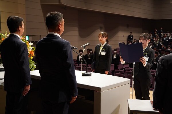 須加尾さんは「私は人と話すことが好きで、学生時代には相手の立場に立って伝え方を工夫することを大切にしてきました。これからはその経験を活かし、組合員一人ひとりに向き合い、安心と笑顔を届けられる職員を目指してまいります」、今井さんは「幼いころから生協の宅配職員が地域の方々の暮らしに寄り添う姿を見てきました。私も組合員の声に真摯に耳を傾け、誰もが安心して暮らせる社会づくりに力を尽くしてまいります」と力強く宣言しました。